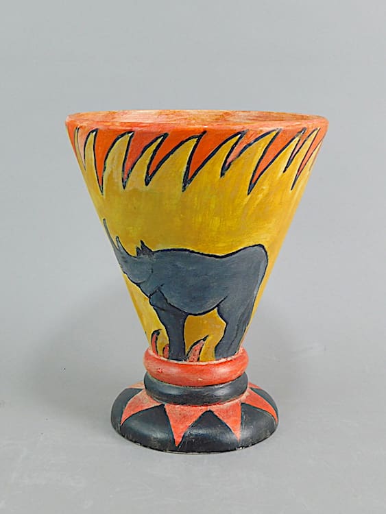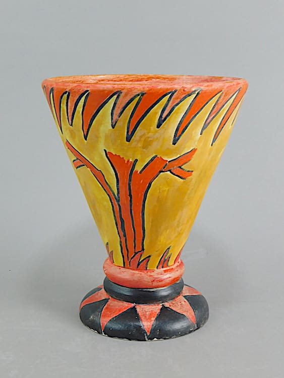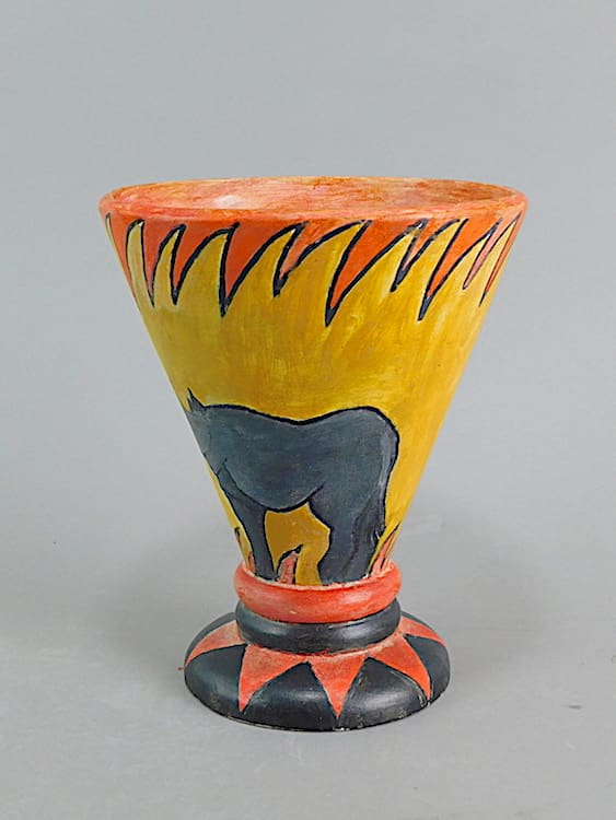 A brightly hand painted but very stylish earthenware vase made in Belgium during the 1930’s. Crudely but stylistically hand painted with an animal and geometric design. Initialed by the artist A.D.