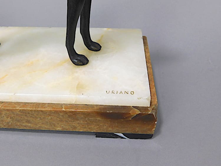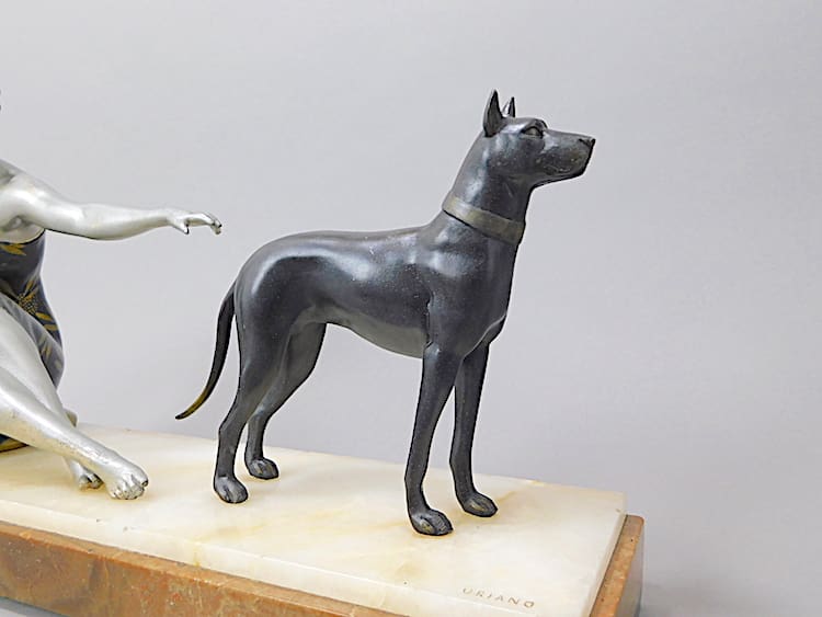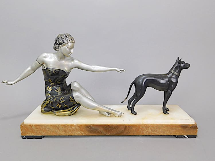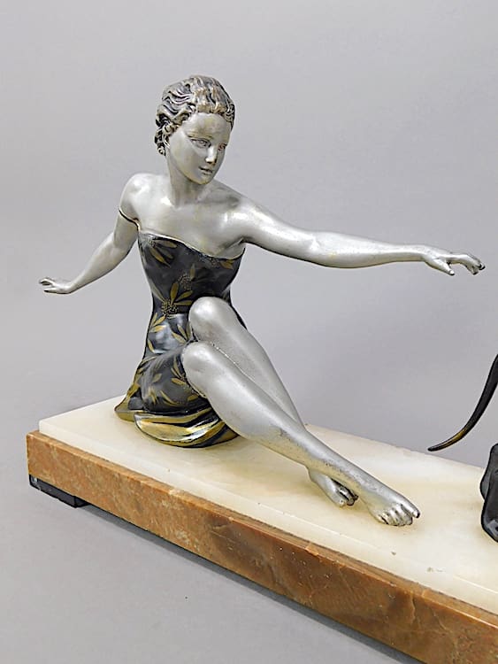A French spelter lady wearing a bronze and gilded enamelled dress and mounted on a base of cream and brown onyx.