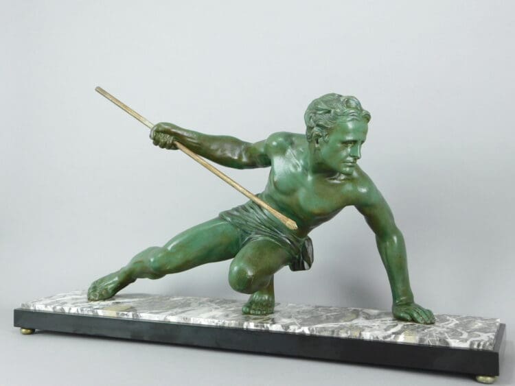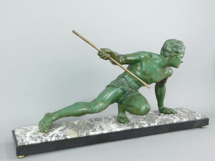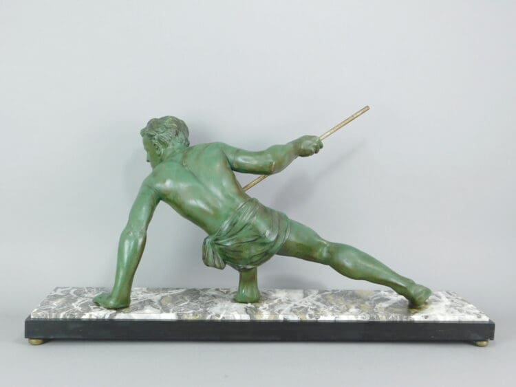 A nice original green patinated spelter man on grey marble with Belgian black marble surround. Unsigned, but by Uriano