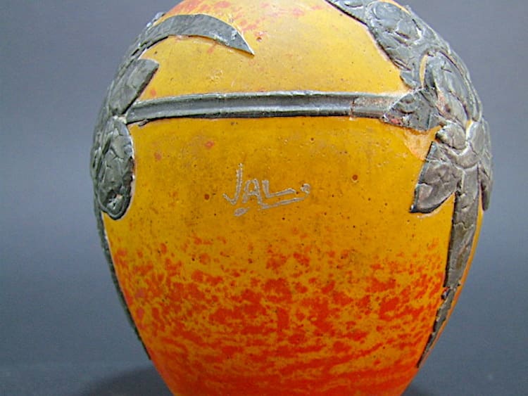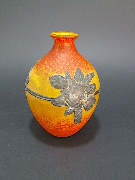 French art deco applied pewter vase by E. Val and signed to the glass. I believe this may be the work of Andre Delatte and E. Val. Made in the 1920s of pate-de-verre layered glass with delicate lead applied floral detail.