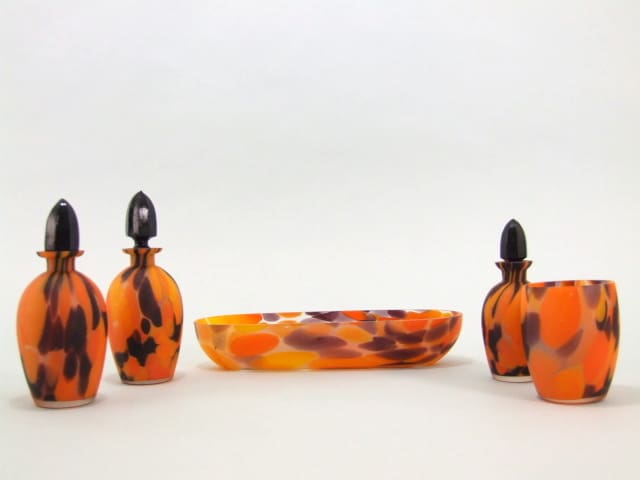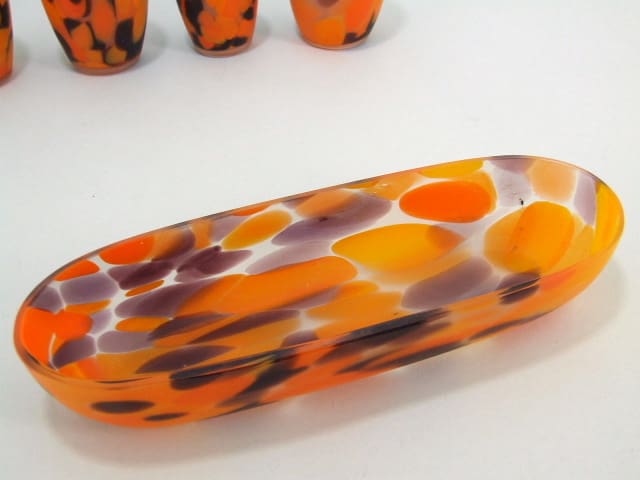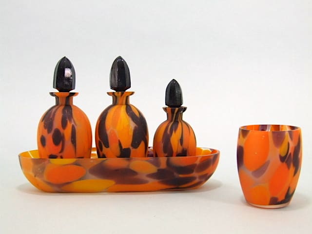 Consisting of 5 pieces including a tray which measures 10 inches (26cm) long and a pair of larger bottles measuring 6.5 inches (16cm) high and a smaller bottle and cup.