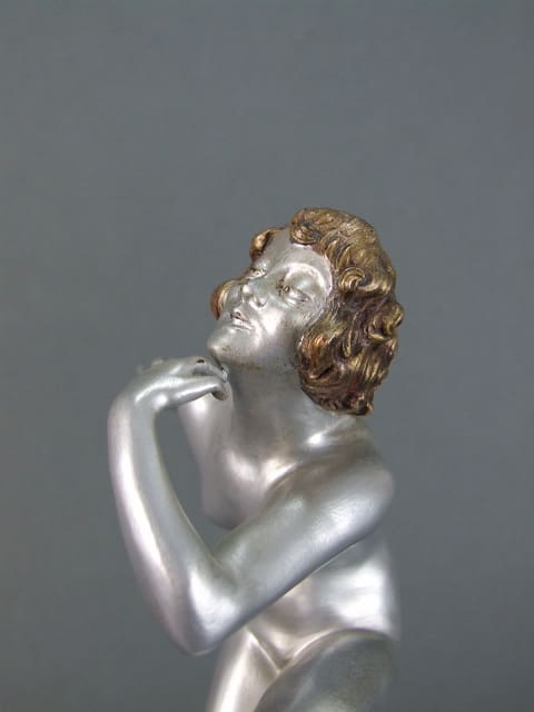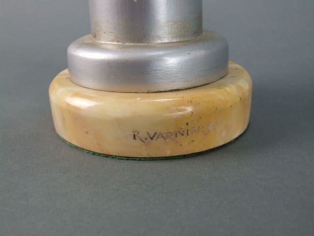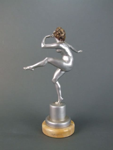 French art deco silvered bronze nude dancer, a signed piece by R. Varnier.