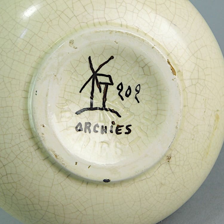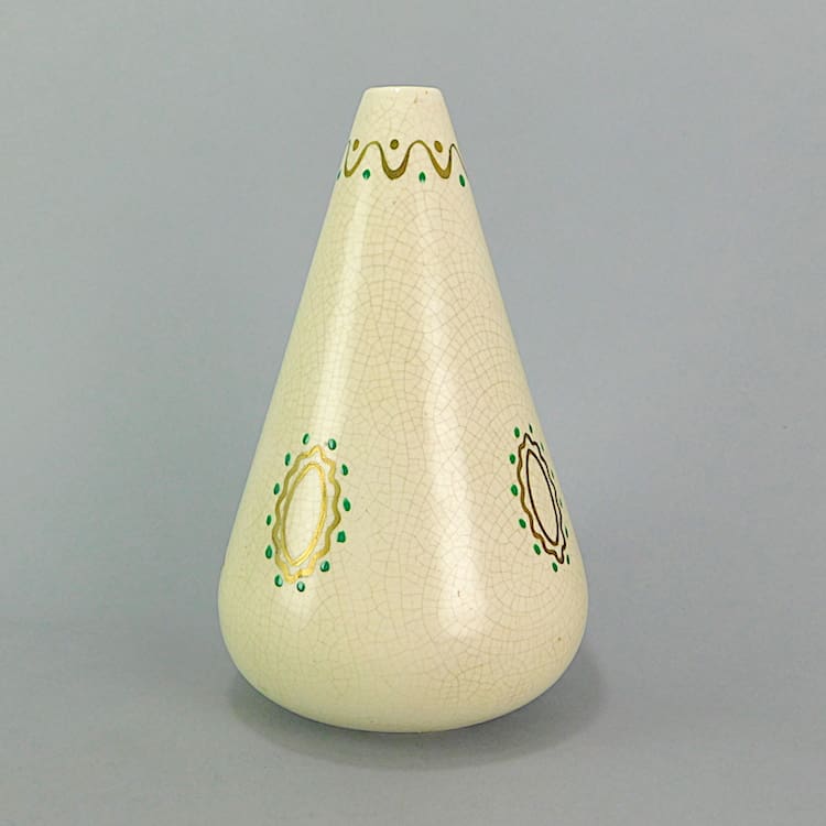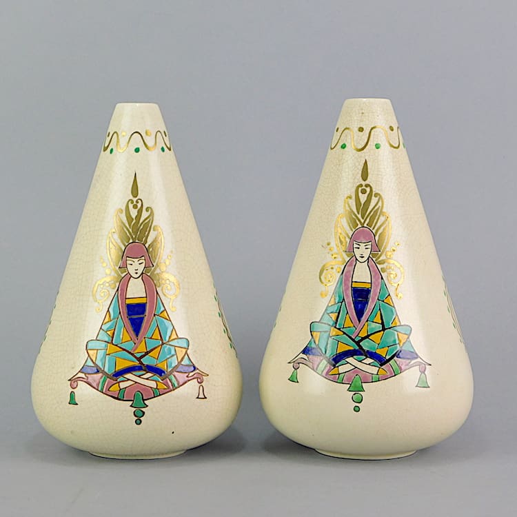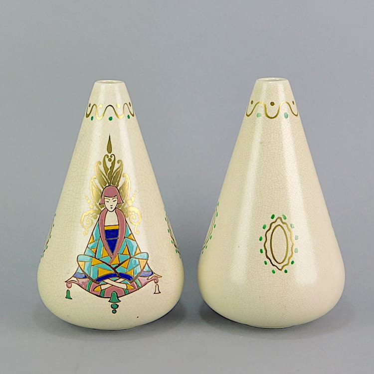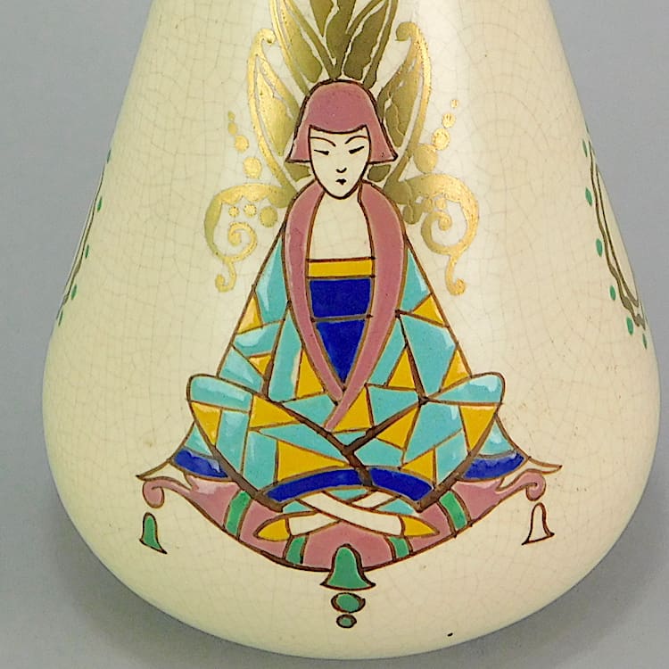 An art deco pyramid vase with a crackle glaze finish and a hand painted flapper lady to the front. Hand painted signature under the base with the Orchies windmill – model number 202. Also shown as a pair with CH1767 (Sold Separately).
