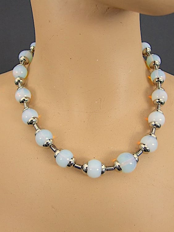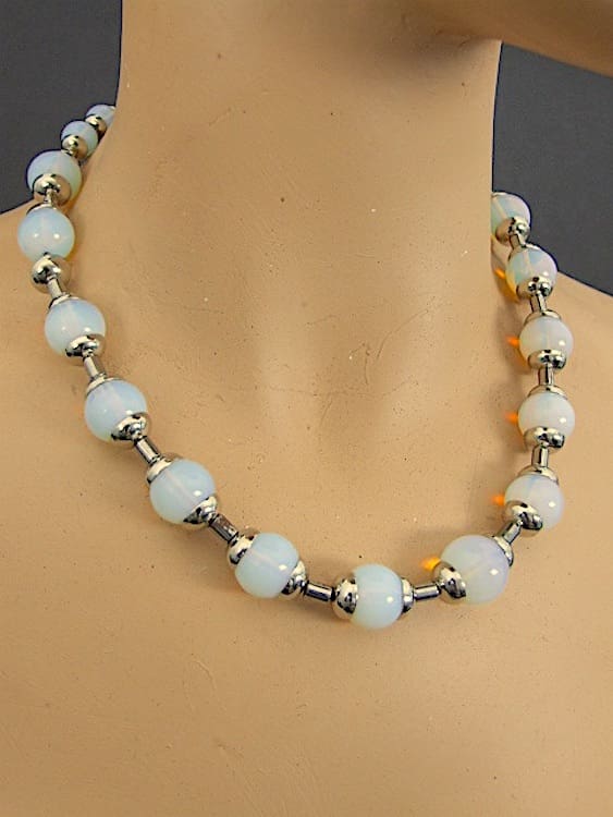 Modernist vaseline glass bead and chrome cups necklace. Made by Jakob Bengel in the early 1930’s and fitted with a screw clasp.
