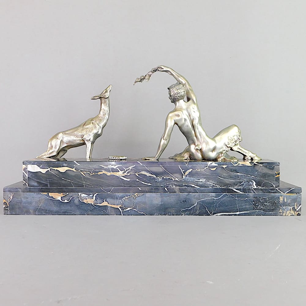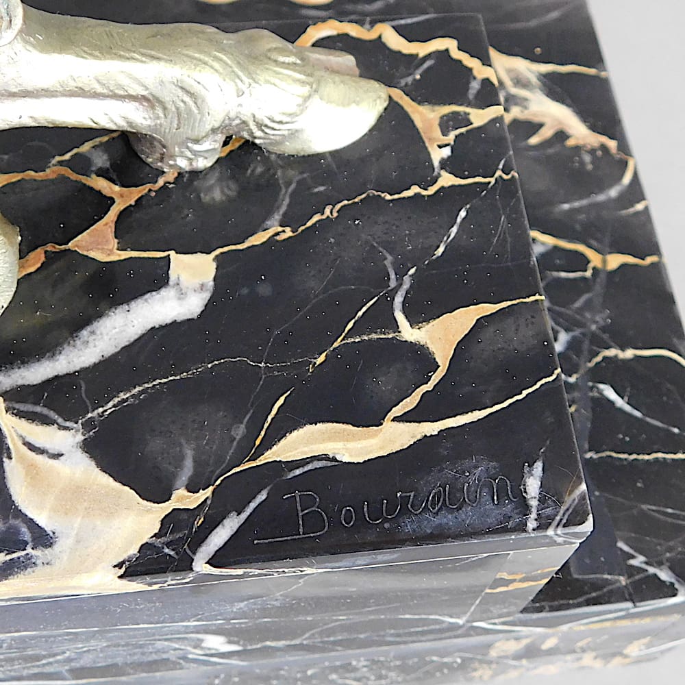 A rare silvered bronze statuary group by Marcel Andre Bouraine signed to the portorro marble base.