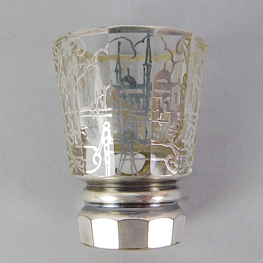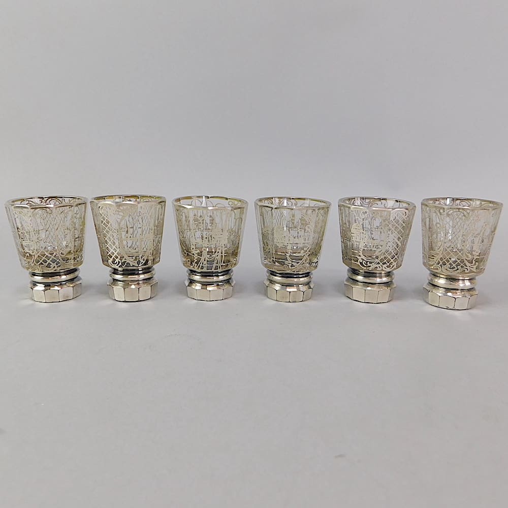 A French art deco silver painted decanter and 6 glasses.