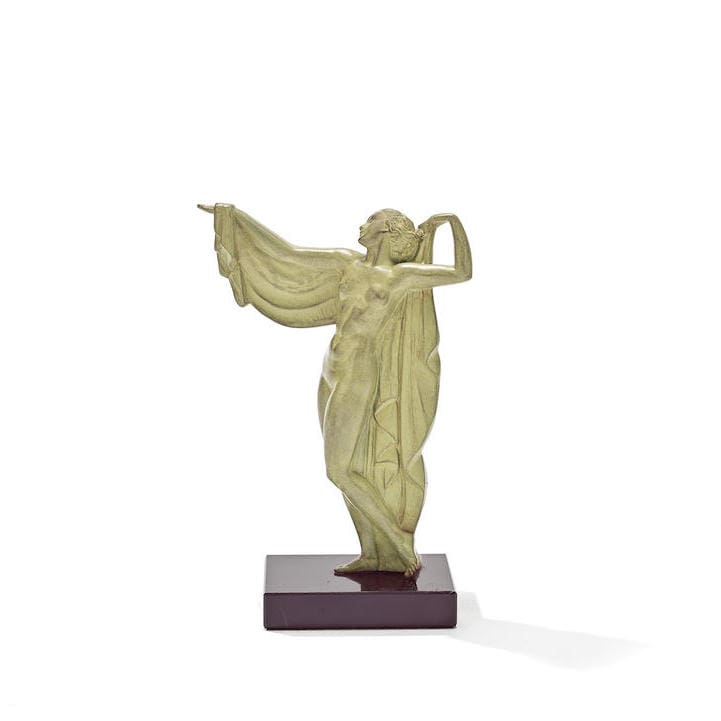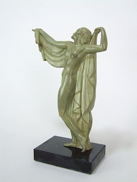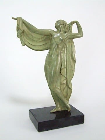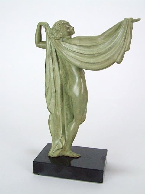 French green patinated art metal piece, signed Fayral – a pseudonym used by Pierre Le Faguays. Mounted on a black marble base.