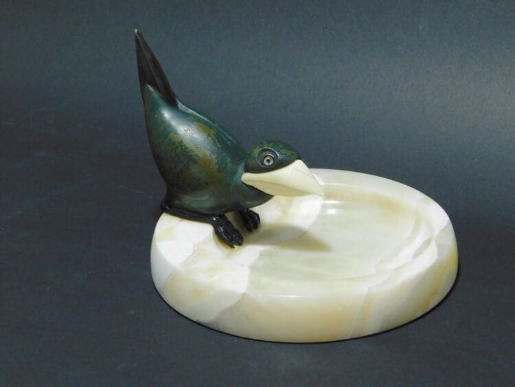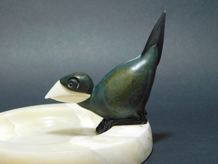 Chyselaphantine vide poche by Marcel Bouraine. French art deco bronze and ivory bird dish. He has glass eyes. His title is Depart and he was made by Marcel Bouraine in the 1920s and signed to the edge of the marble base.