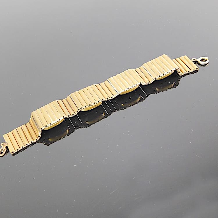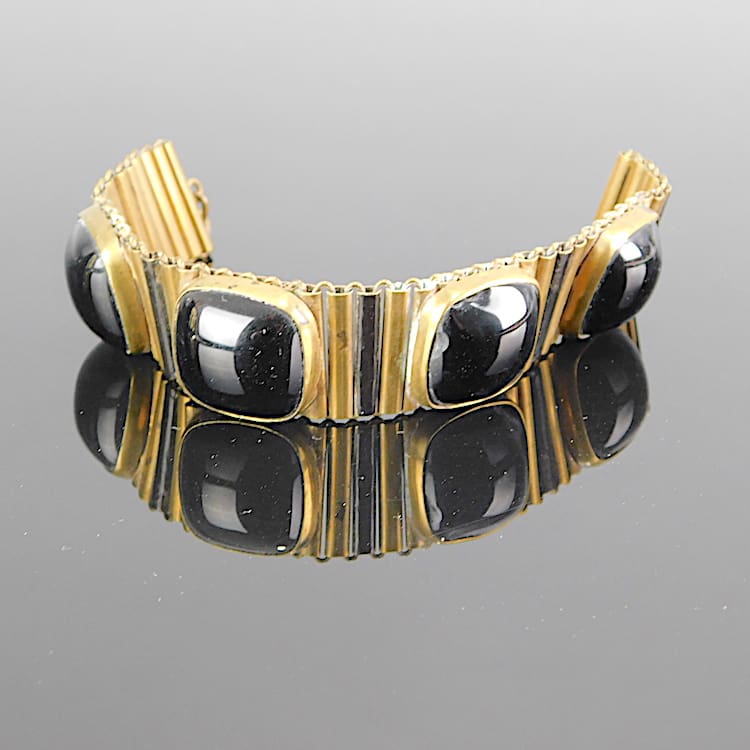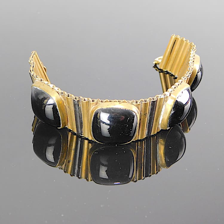 Vintage bracelet from the 1930’s. Brass tubed bracelet with black enamel painted panels and black glass cabochons.