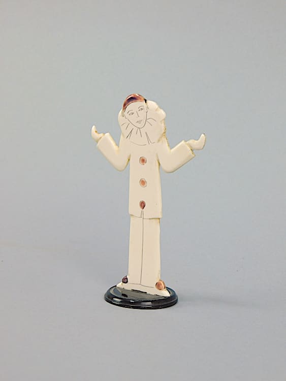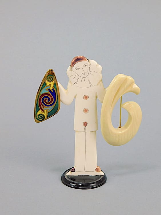 Phenolic jewellery stand, possibly Ebena, modelled as a pierrot holding hoops.