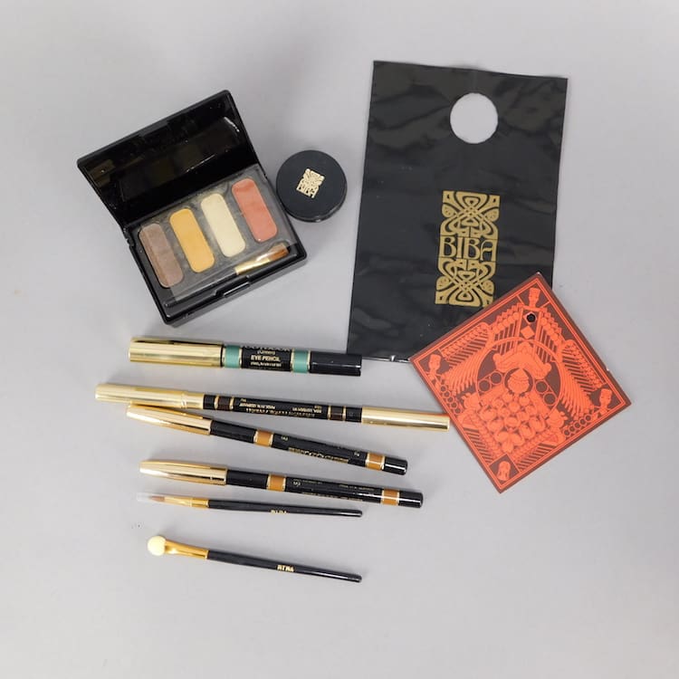 Vintage 1960s/70s original Biba make up gift set. 4 eye pencils, 2 brushes, 1 shadow in sand bar, eye shadow tint set in brown and cream autumnal colours with brush, Biba small make up gift bag and an original biba gift label. I cannot guarantee if the pencils are still working as all the items are now 50 – 60 years old.