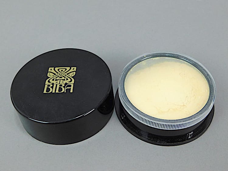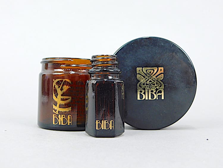 Circa 1969 original Biba items, a dedicated mask jar (no lid) with the lady and sunray silhouette, translucent gold dust loose powder with powder, oil bottle and gift tag.