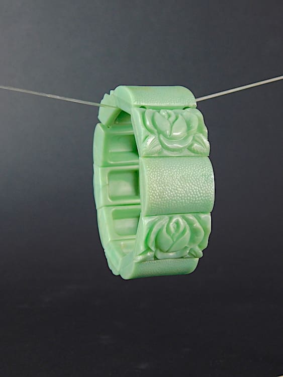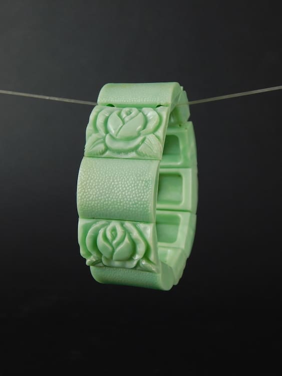 Original period green celluloid elasticated bracelet with alternating rose panels.