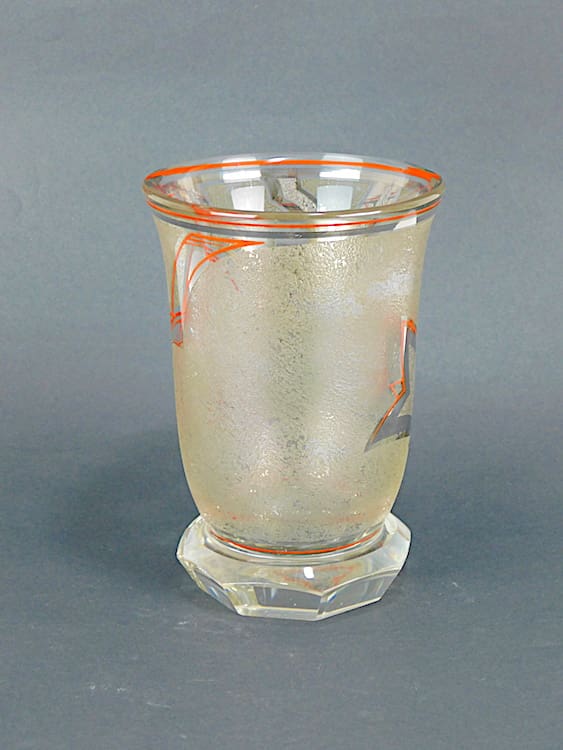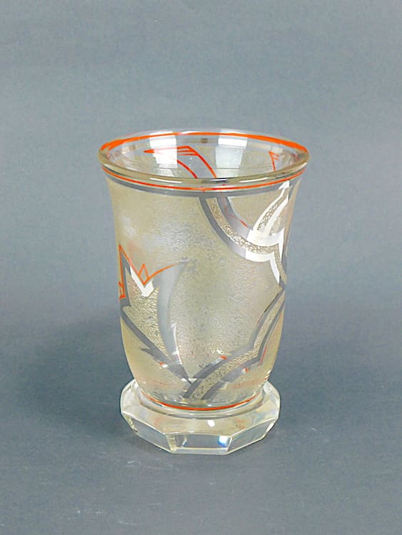 Beautiful 1930’s Czech glass vase with red enamel and etched detail in leaf pattern with mirrored glass patterning.