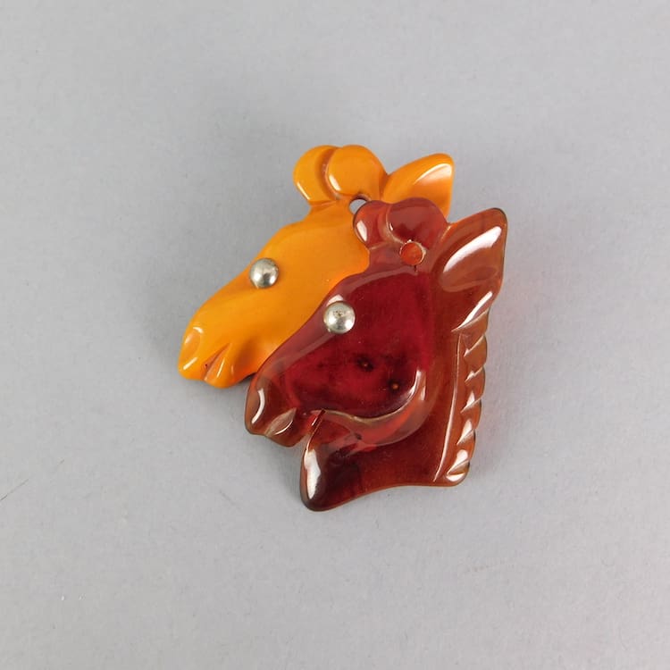 French double deer brooch in galalith and lucite. It is hand made and made in the 1920s.