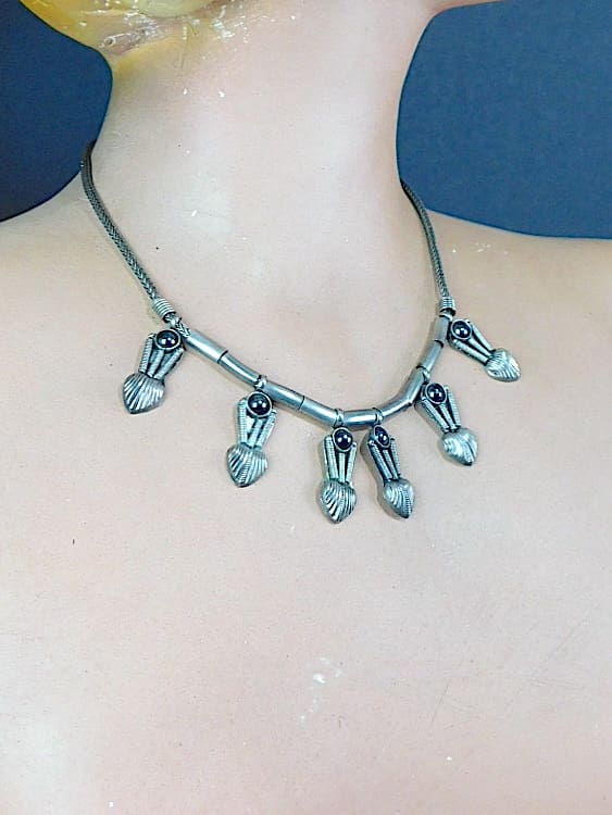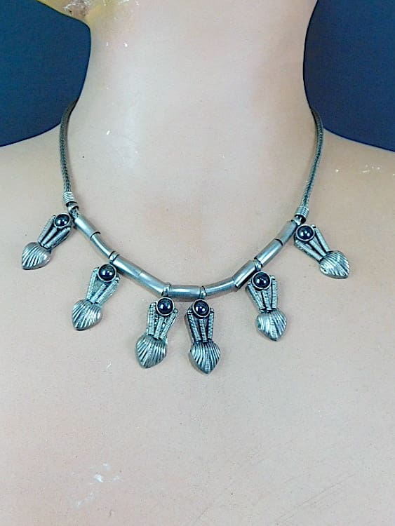 Probably silver plated with black glass stones and a pair of matching earrings for pierced ears.