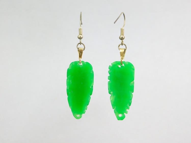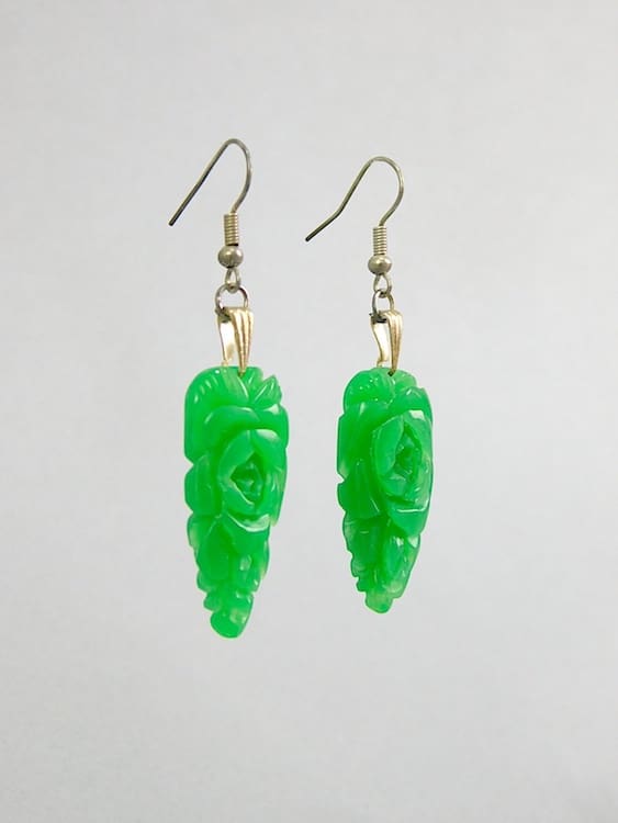 Green stylised floral patterning moulded galalith earrings. Fitted with new silver hooks for pierced ears.