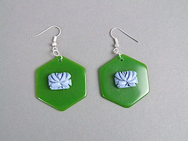 Modernist green and blue floral earrings, made of vintage phenolic material. Fitted new silver hooks.
