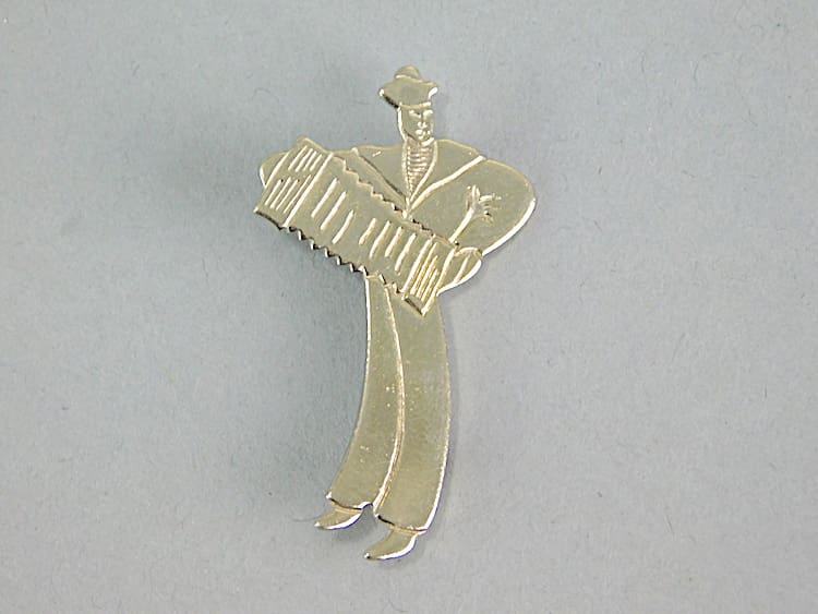 French art deco chrome sailor playing a harmonium brooch.