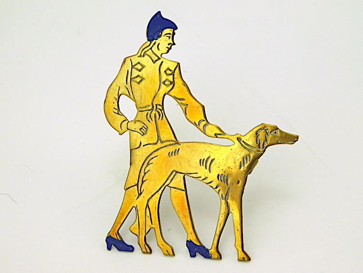 This is the 2nd larger style art deco Vogue brooch which was given away free with a years subscription to Vogue magazine in the early 1930s. Gilt metal lady and dog with Purple enamel hat and shoes.