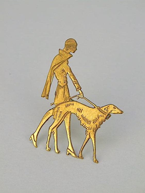 Original 1920’s Vogue brooch of a lady and borzois dog. These brooches were given free with a years subscription to Vogue in the 1920’s.