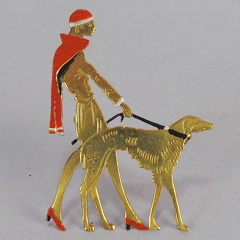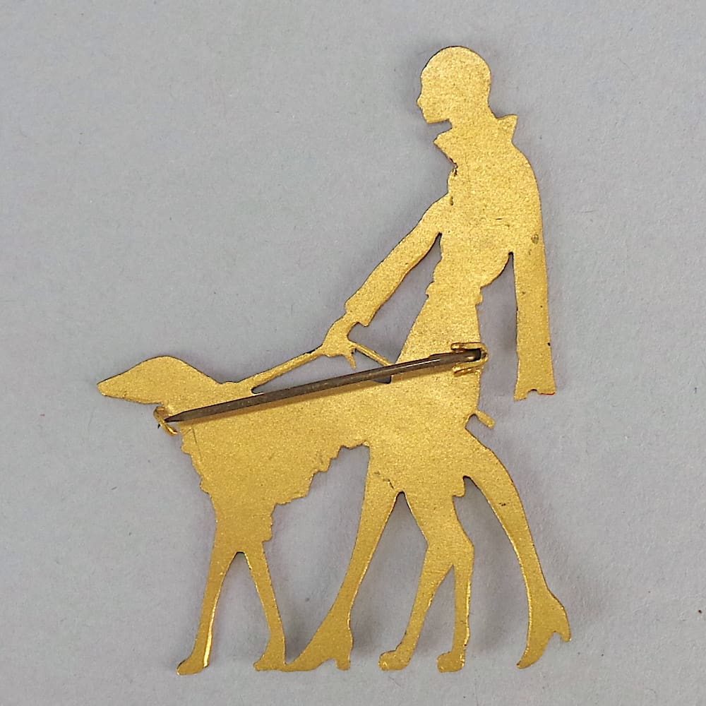 Original 1920’s Vogue brooch of a lady and borzois dog.