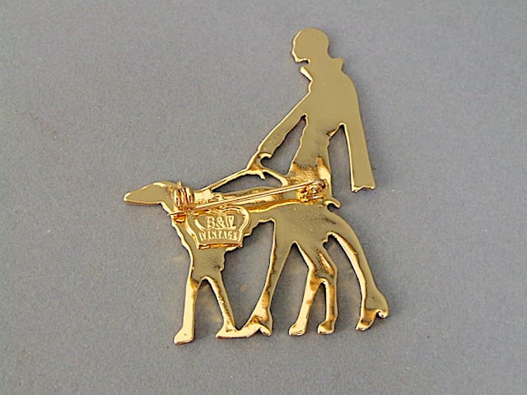 Butler and Wilson lady and dog art deco vogue brooch. Made in a limited edition as an anniversary piece and signed B and W to the back. Fitted with a roll safety clasp.