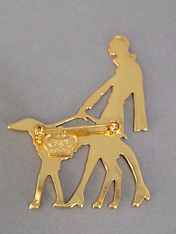 Butler and Wilson lady and dog art deco vogue brooch. Made in a limited edition as an anniversary piece and signed B and W to the back. Fitted with a roll safety clasp.