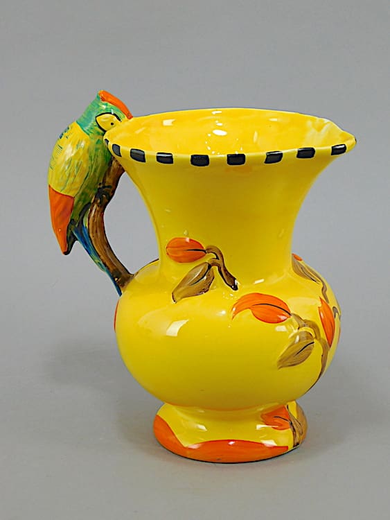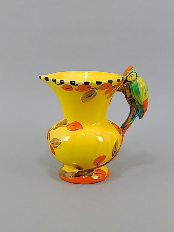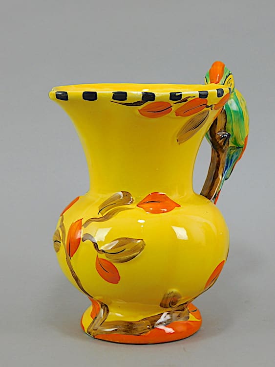 A nice woodpecker handled jug with yellow glaze and beautifully hand painted. Although unsigned, I believe by Wadeheath.