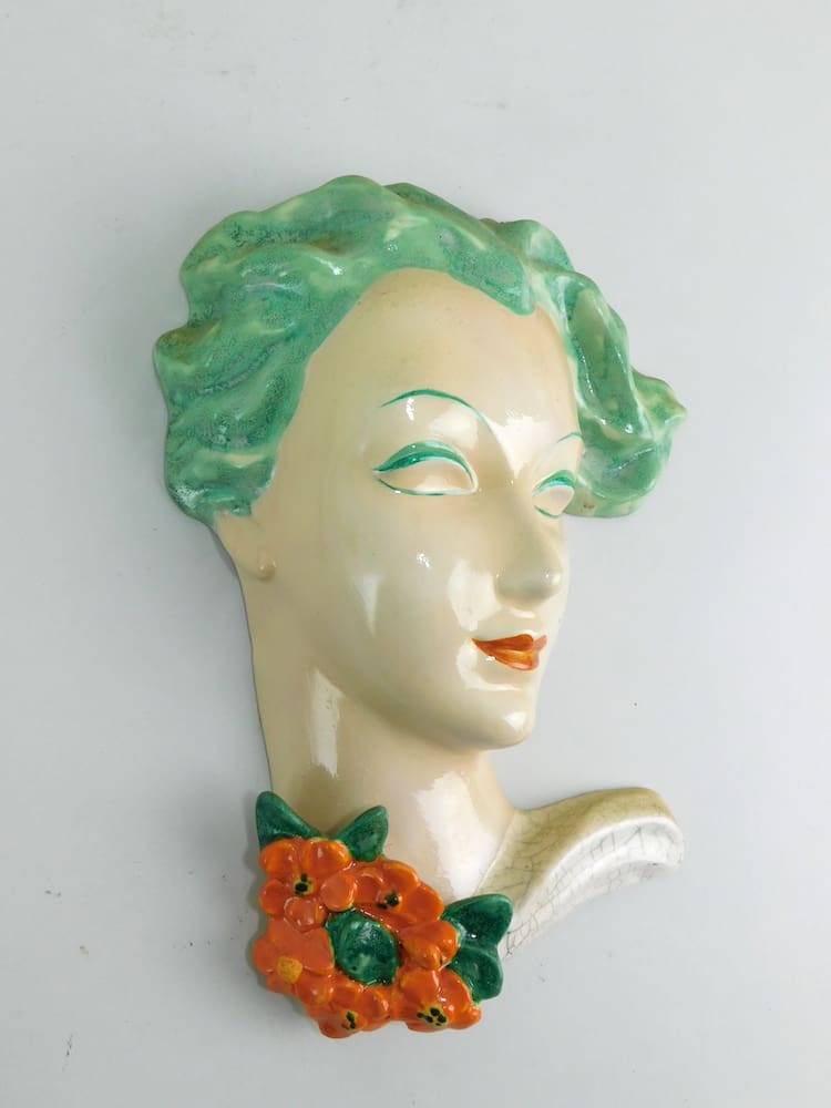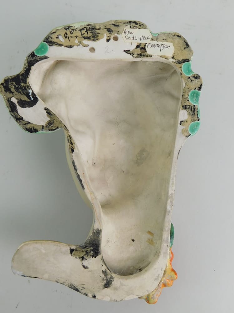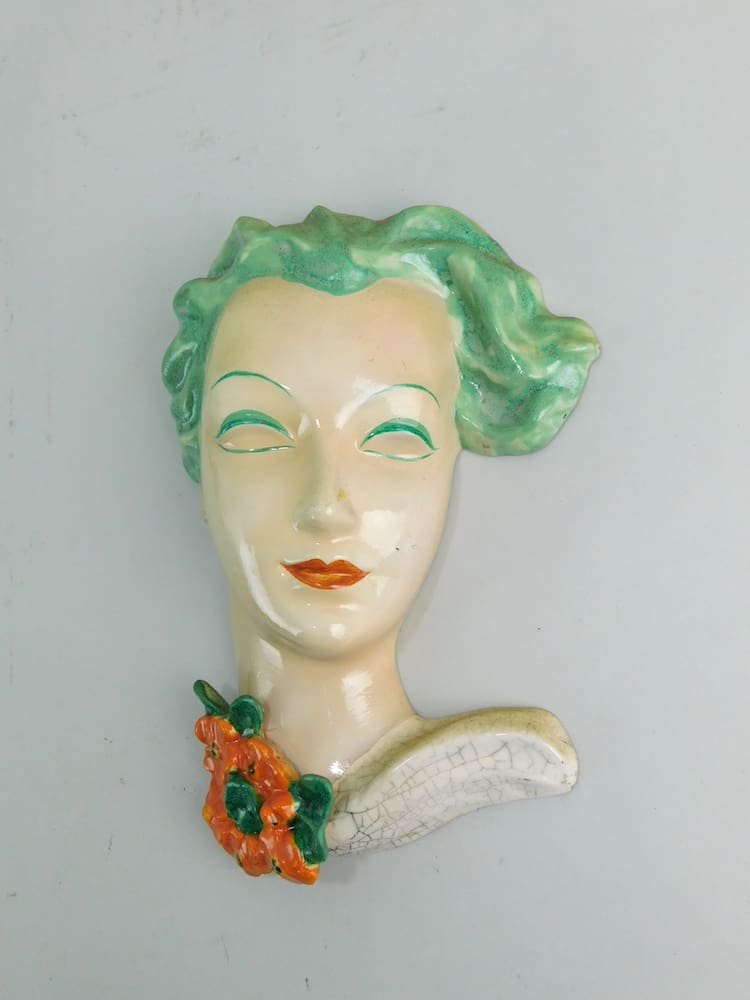 A lovely 1930s mask, hand made. No makers marks but by Alma Seidl-Heck. I also have the high glaze version of this mask (plq591), please ask for pictures.