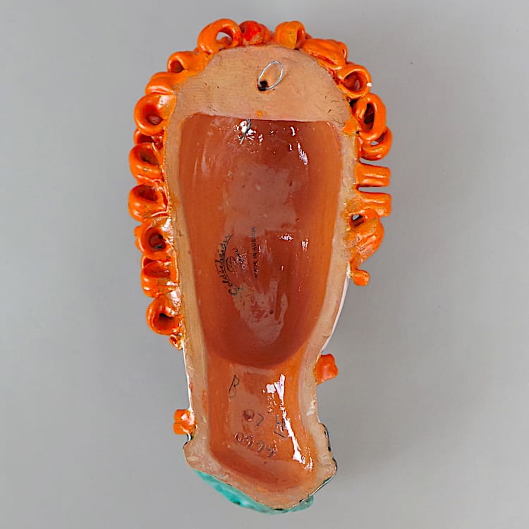 Hand painted terracotta Art Deco wall mask, designed by Rudolf Knoerlein in 1932.