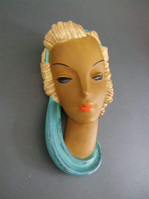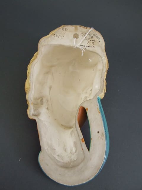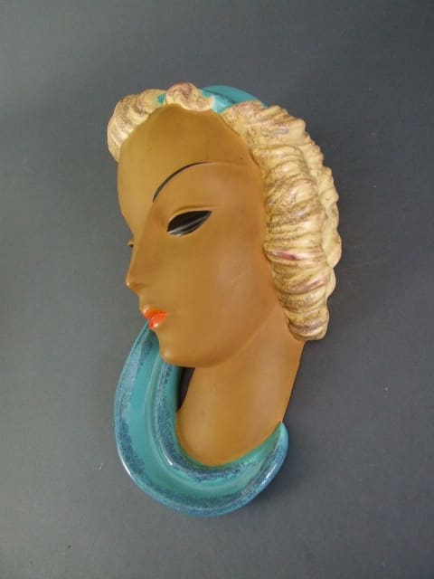 Another Goldscheider hand painted art deco wall mask made in 1937 and designed by Adolf Prischl. Marked to the reverse, Goldscheider Wien Made in Austria and bearing the model number 8041.
