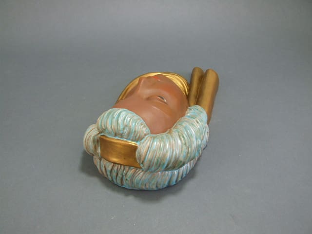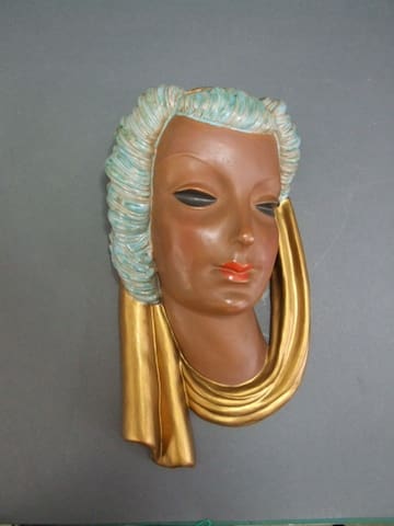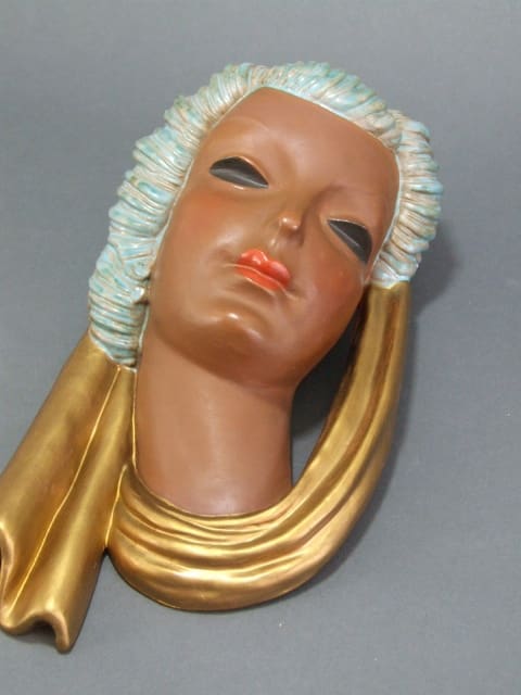 Goldscheider hand painted art deco wall mask, designed by Adolf Prischl in 1937. Marked to the reverse Goldscheider Wien, Made in Austria and bearing the model number 7883 and initialled MT. This model number gets a mention in the Filipp Goldscheider book.