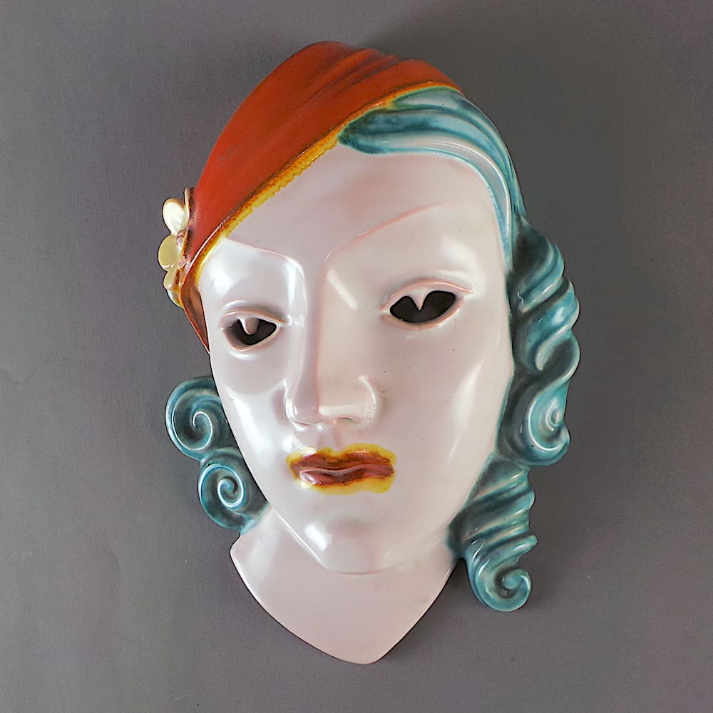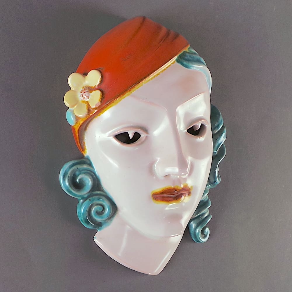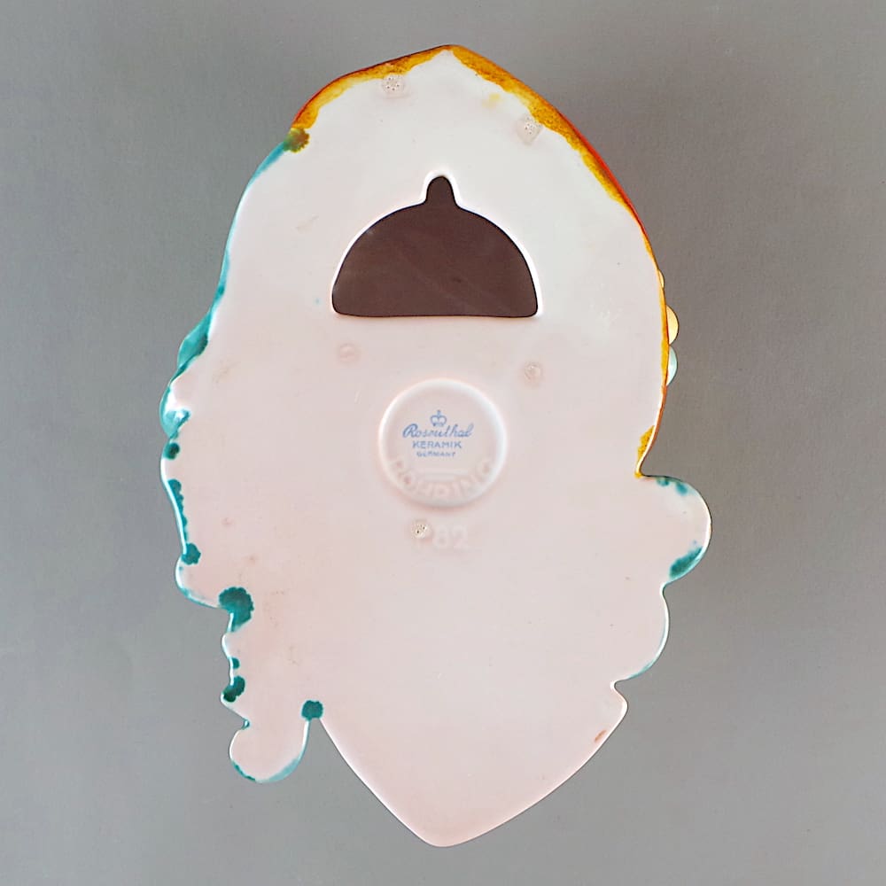 Rare German Art Deco wall mask by Rosenthal. Hand painted with cut out eye detailing.