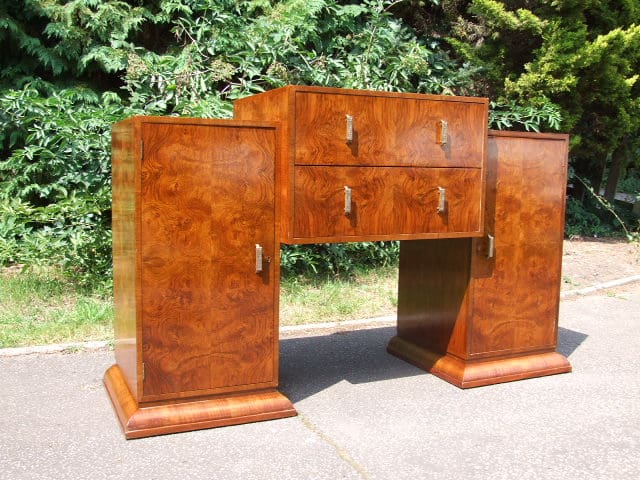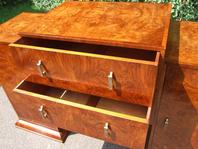 A figured walnut, Epstein style art deco sideboard with bronze handles. Two central drawers and end cupboards each with a cutlery drawer and two shelves.