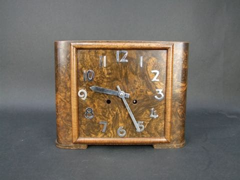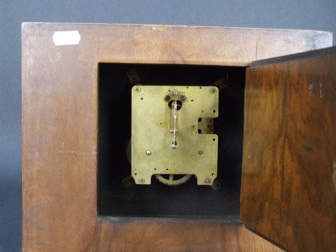 Walnut clock with modernist chrome hands. The clock comes with its original pendulum and key.