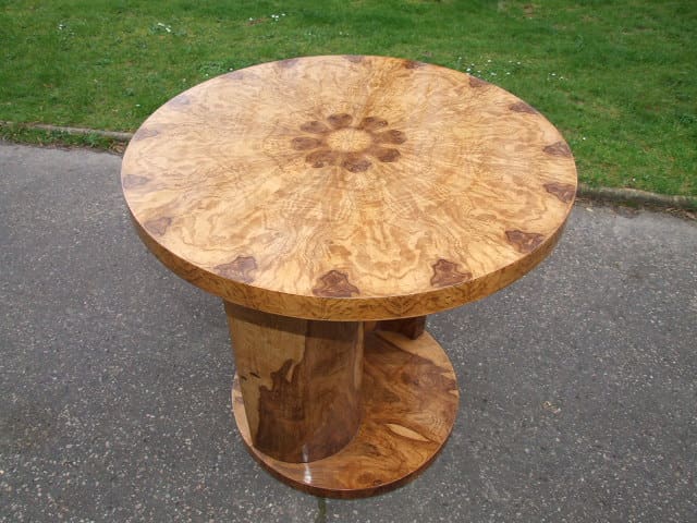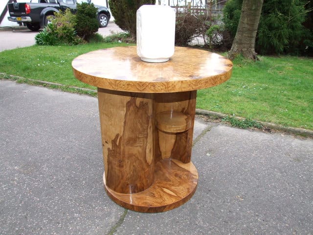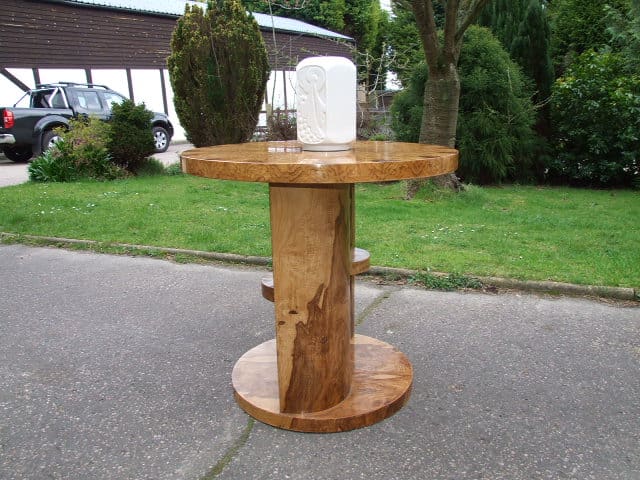 A blonde walnut veneered table in an art deco style. It is a modern reproduction of a 1930s piece. Two smaller internal display shelves to the central stem.