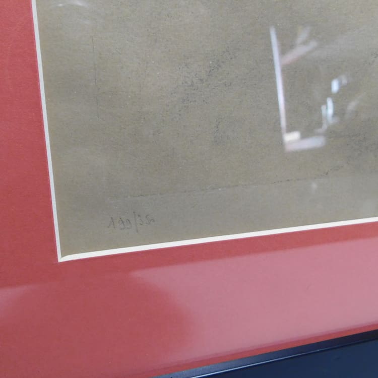 Professionally reframed in black wood with pink mount.