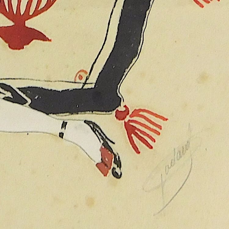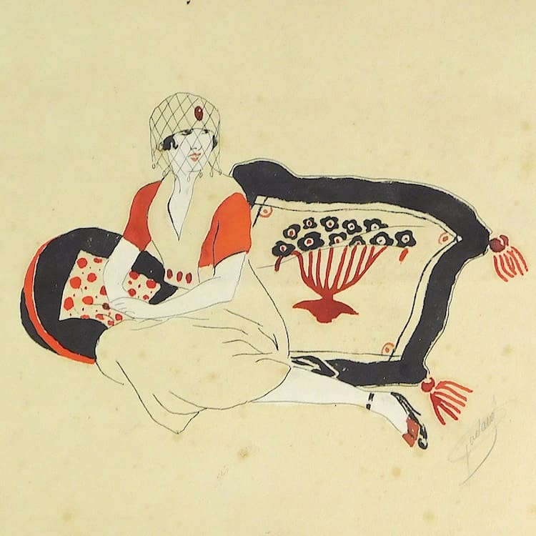 Lovely original 1920s French watercolour of a lady with cushions, signed by the artist Godard. Framed in a contemporary frame.