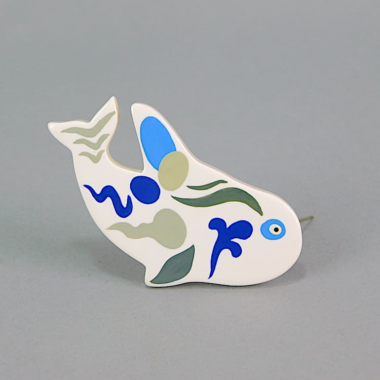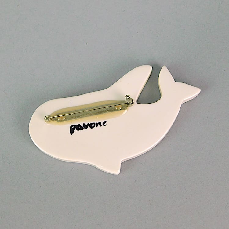 French vintage galalith hors-series whale brooch. Hand made and painted by Marie-Christine Pavone, signed to the rear and fitted with a roll safety clasp. These hors-serie items are now very rare.