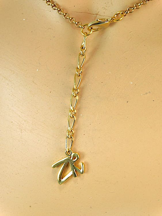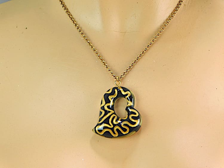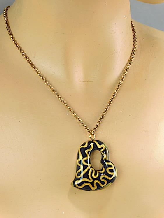 Brown and gold wiggle heart pendant by Zandra Rhodes. To the end of the chain is Metal ZR logo.