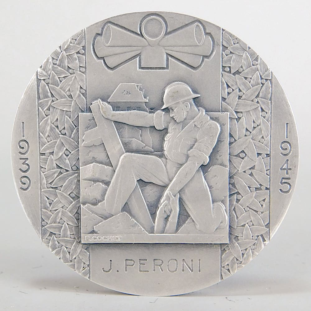 It is dated to 1939 and 1945 to commemorate WW2 and bears the name J. Peroni.