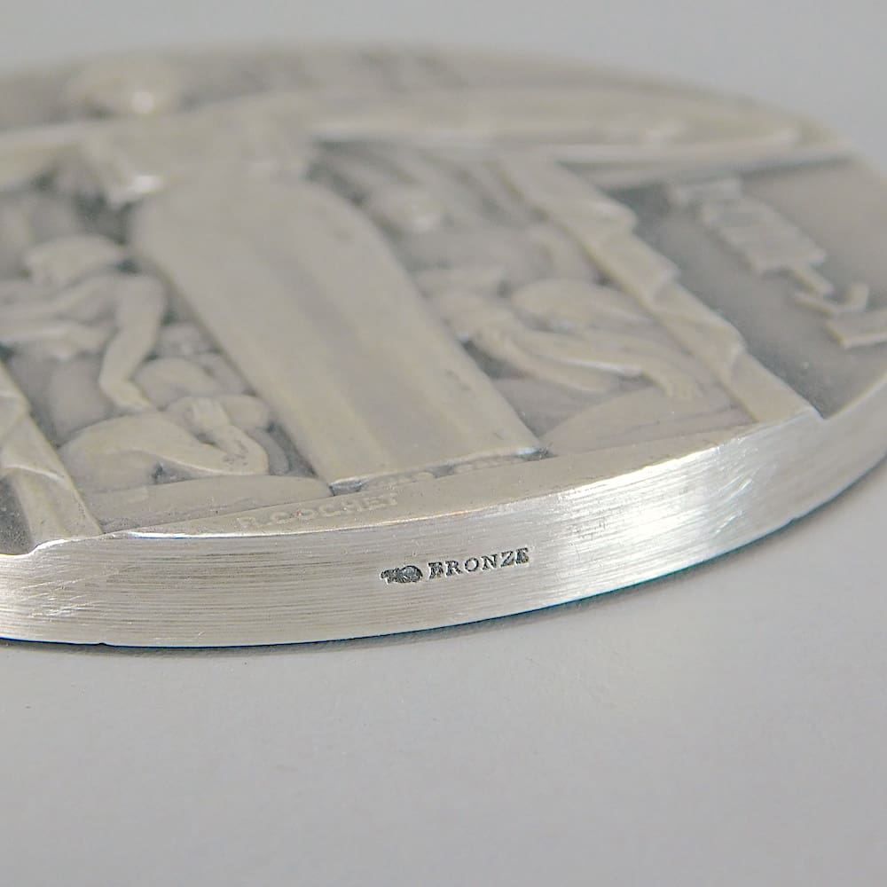 French silvered bronze medal of a winged lady that reads – Defense Passive and is signed R. Cochet.