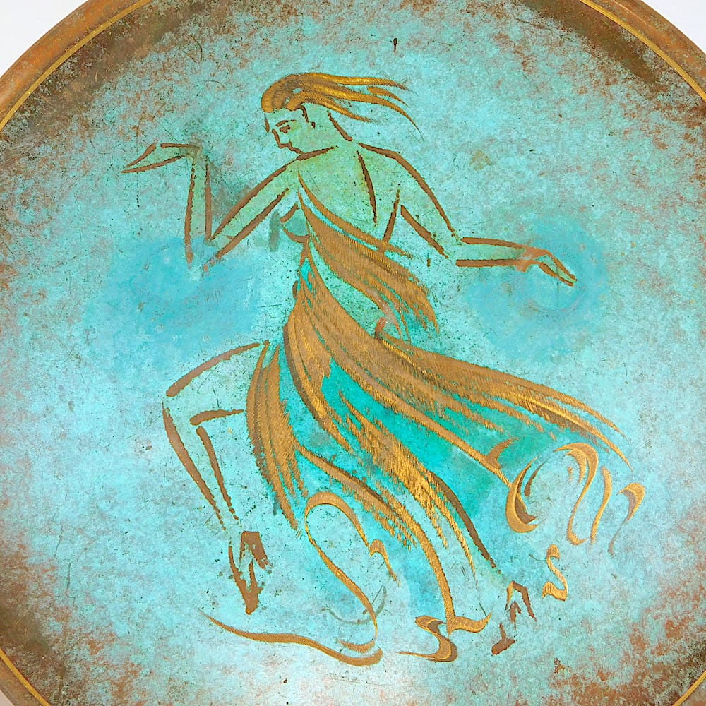 WMF Ikora bowl with a dancing lady bowl in blue enamel, on a footed base.