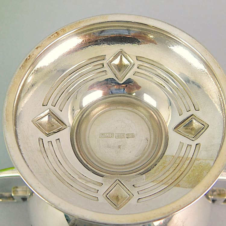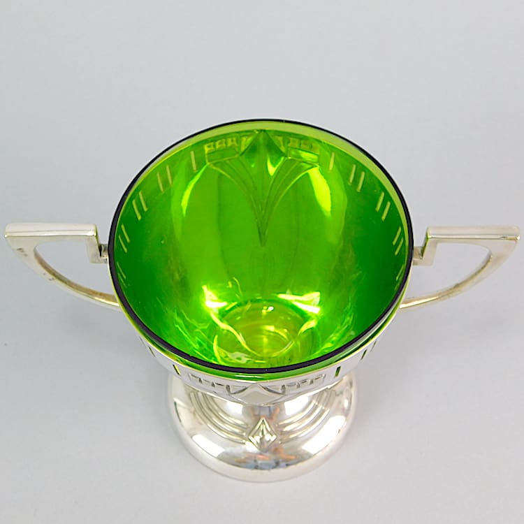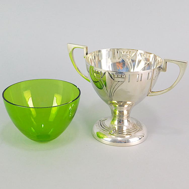 WMF silver plated sugar cup. Marked WMF beneath with EPNS mark. Original green glass liner.