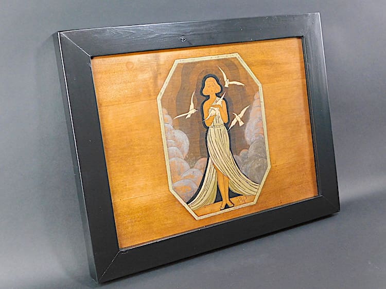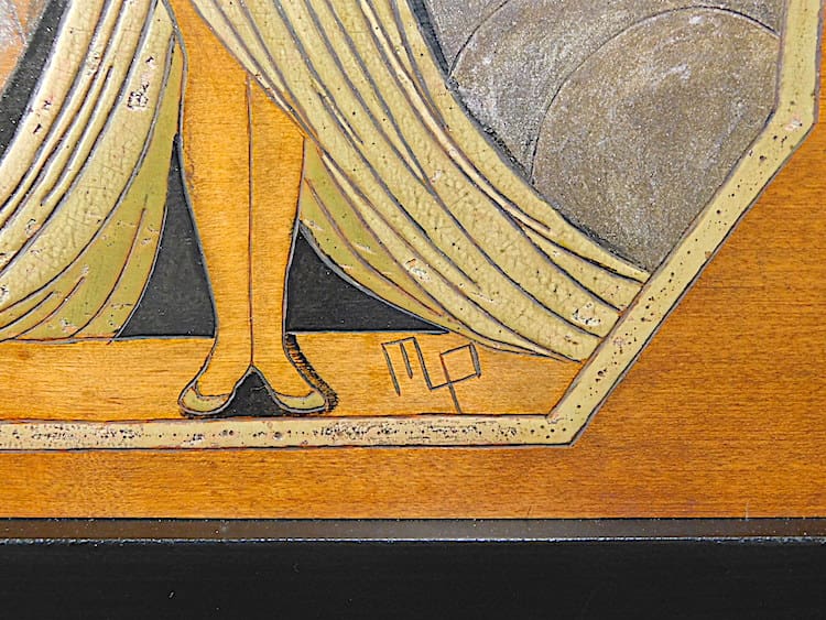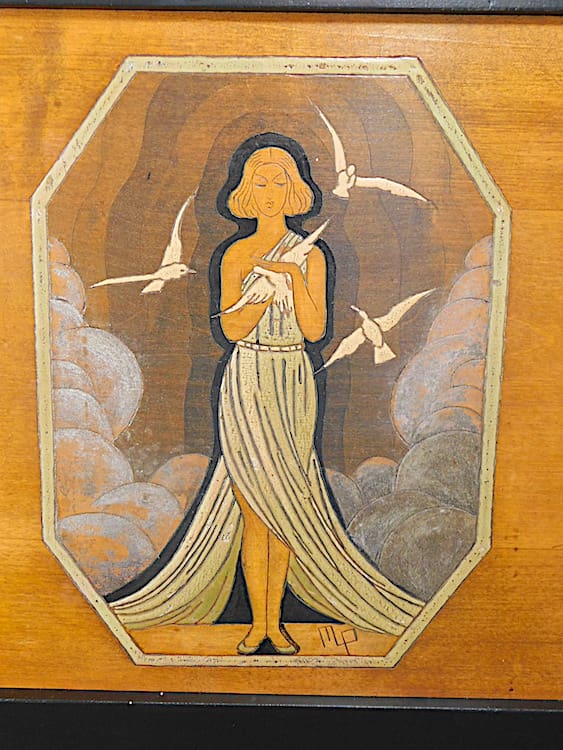 French wood panel with a hand painted and carved lady with doves. Signed MP and mounted in an ebonised oak frame.