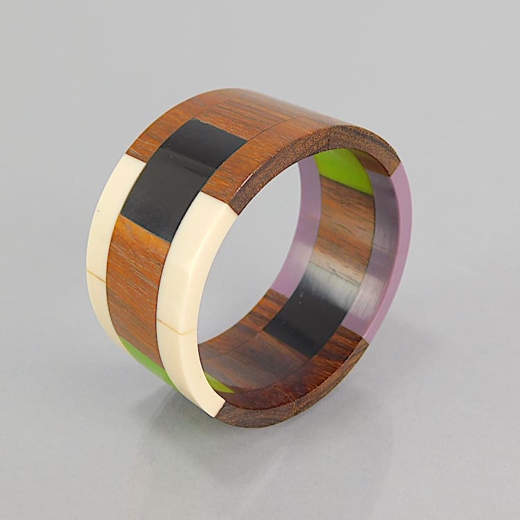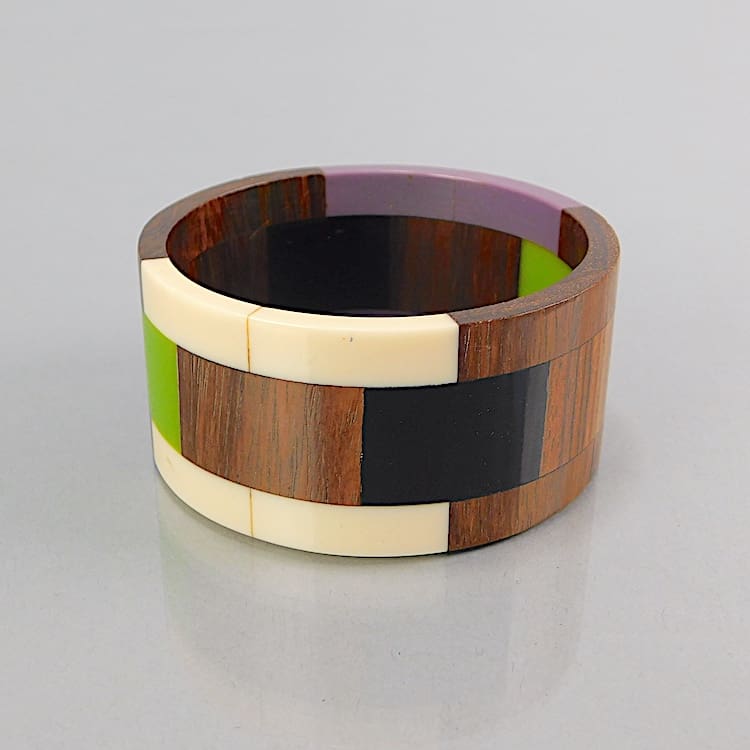 Chunky art deco wood and cream, black, green and purple phenolic bangle.