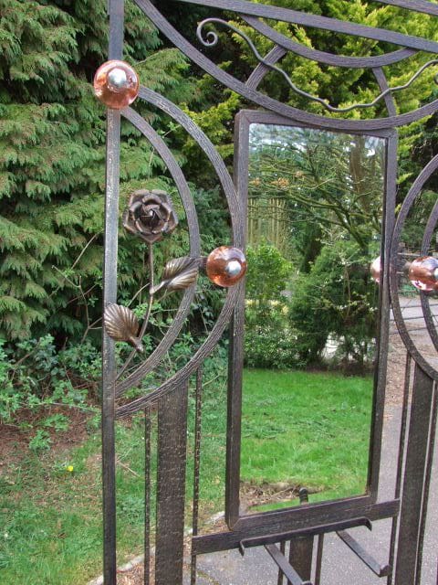 Four peach glass globe coat hooks, central bevelled mirror and upper hat shelf. Decorated with rose and leaf detail and geometric patterning.