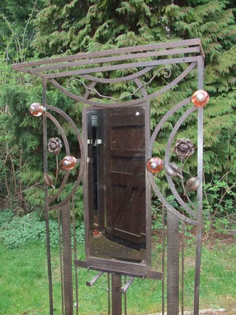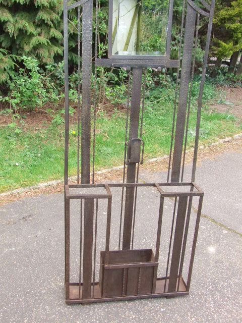 French art deco wrought iron (fer forgé) coat stand with sections for umbrella and central planter.