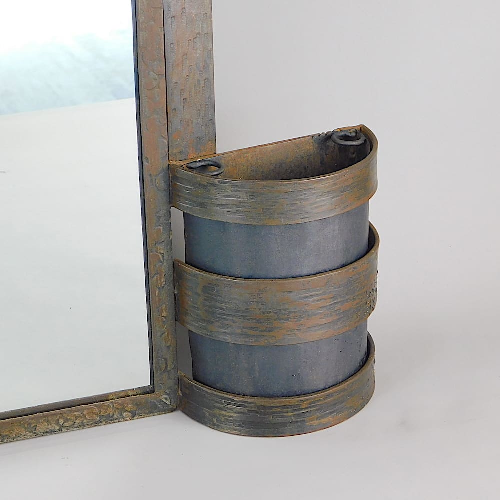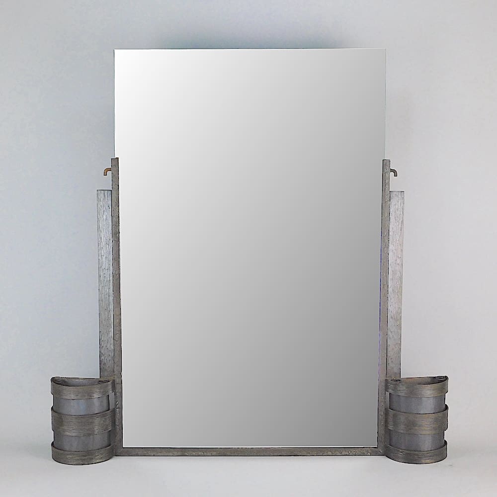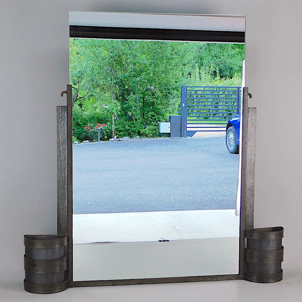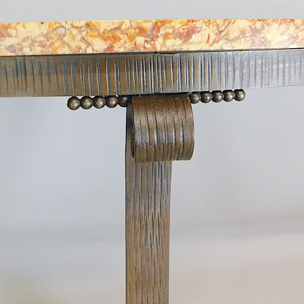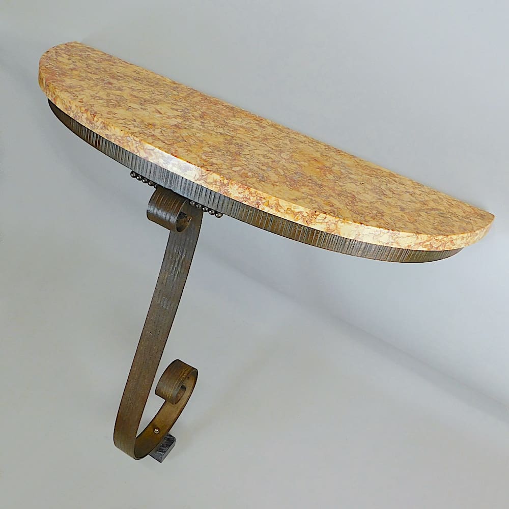 French art deco wrought iron console table with marble shelf and mirror section above a lovely scroll and ball detail frame.